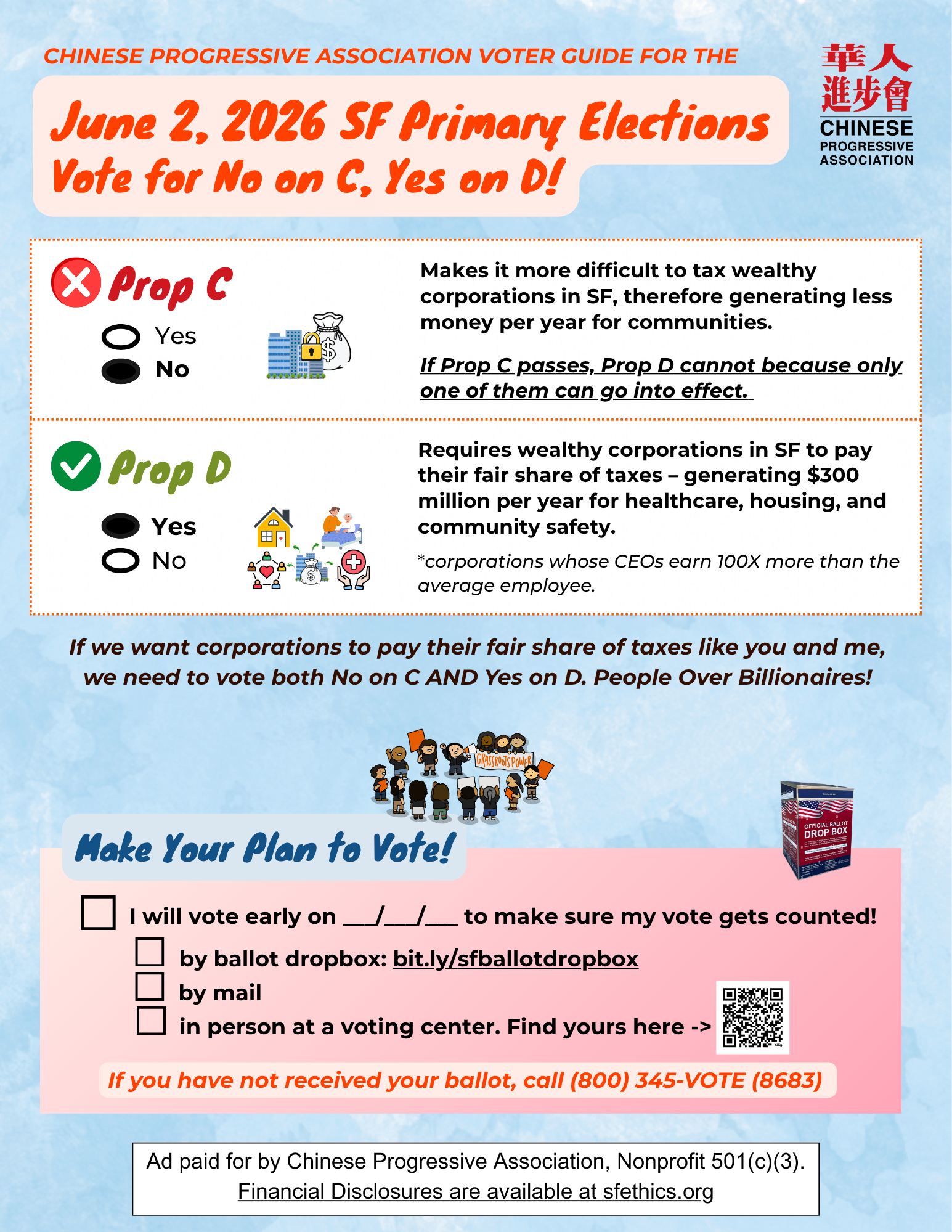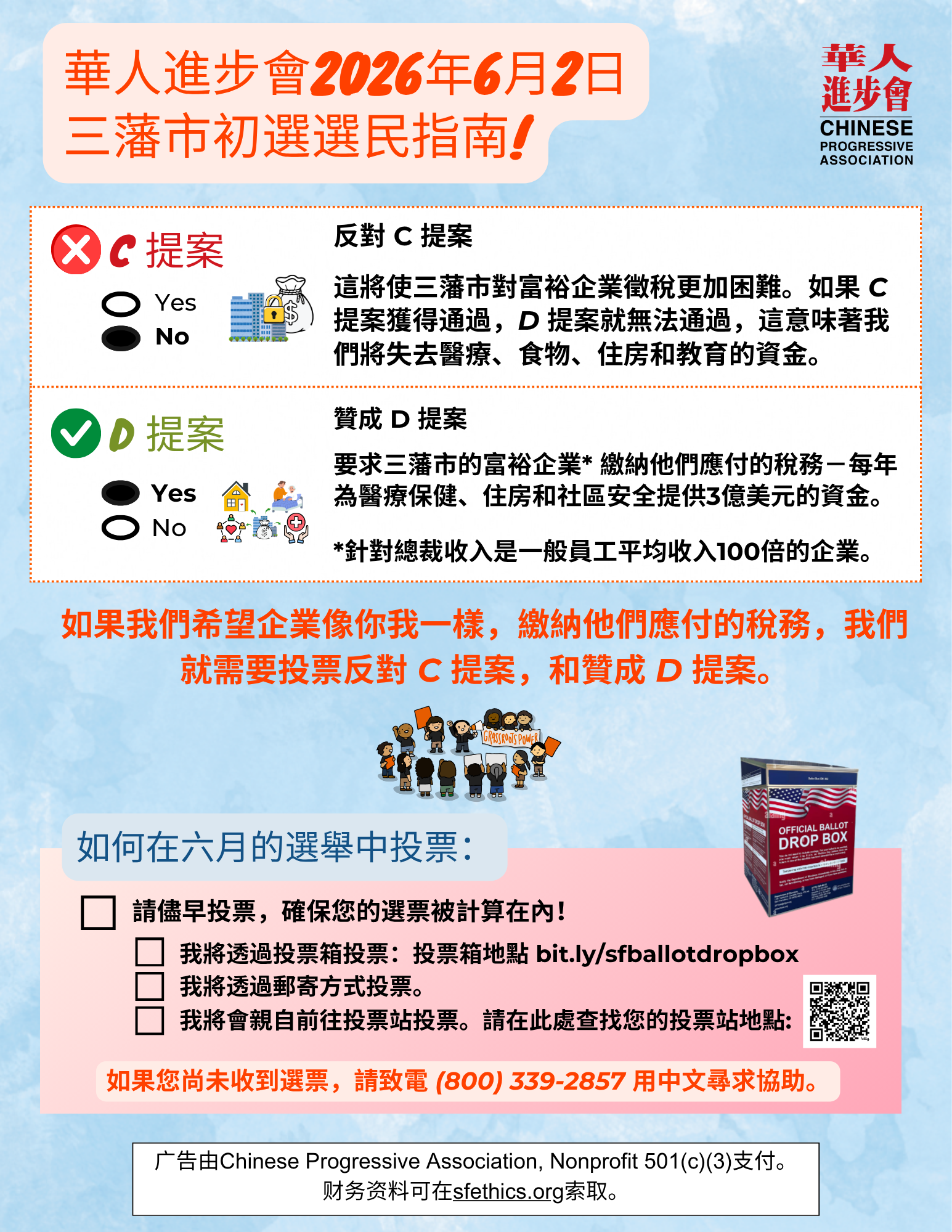 華人進步會的會員和職員互相教育和討論本地及加州選舉提案,並依據我們改進三藩市移民工薪家庭的宗旨和工作,共同作出以下的背書。華人進步會的會員向選民推薦以下立場.