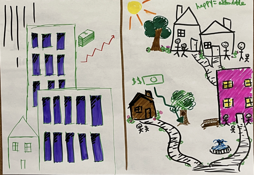 Image from a Youth MOJO workshop. Left image: how we think upzoning will impact our city. Right image: How we want our futures in this city to look like.